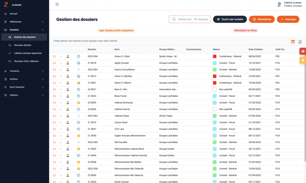 Par défaut, la “Gestion des dossiers” affiche la liste des dossiers actifs avec des fonctionnalités complémentaires.