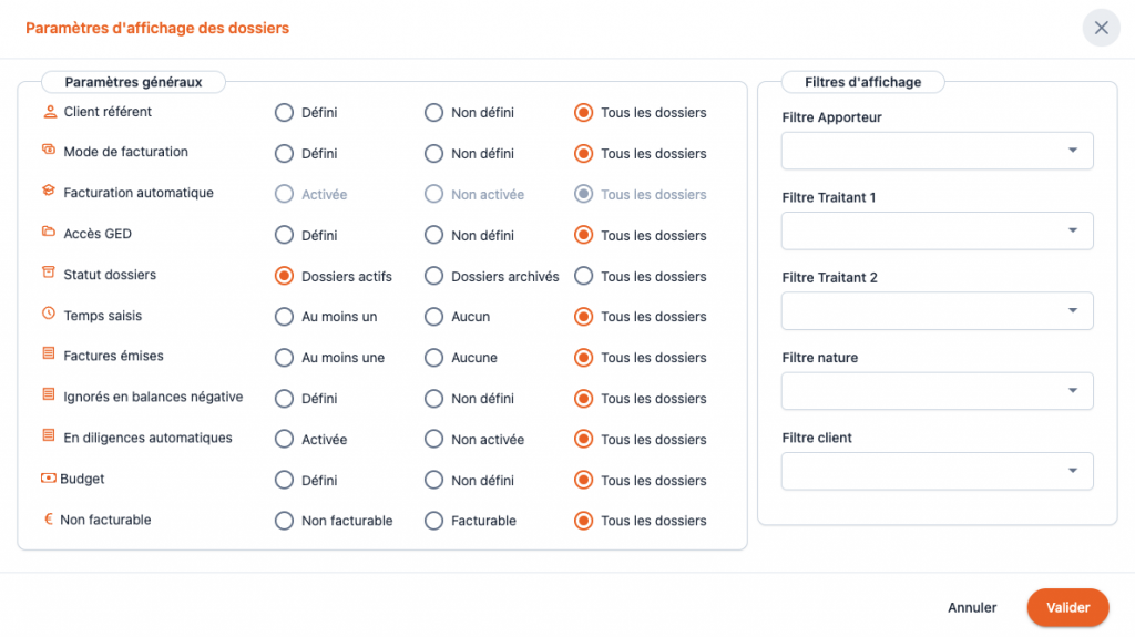 Permet d’afficher une liste de dossier avec un mode de facturation défini ou non défini. Les modes de facturation possible sont aux temps passés, forfait, résultat ou encore non facturable.