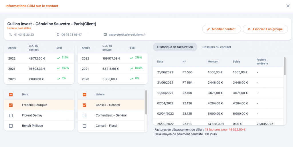 • L’historique de facturation du contact avec éventuellement les factures en dépassement de délai
