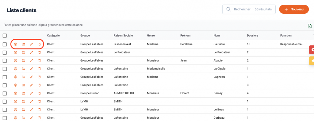 La liste des clients permet d’afficher tous les contacts liés aux dossiers ou non. Cette liste est enrichie au fur et à mesure des contacts créer dans les dossiers.