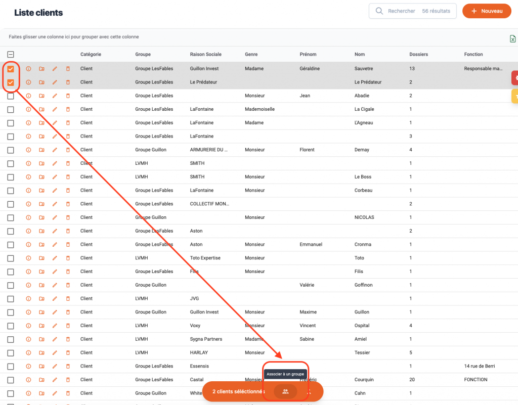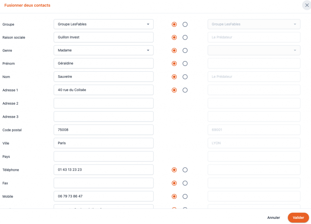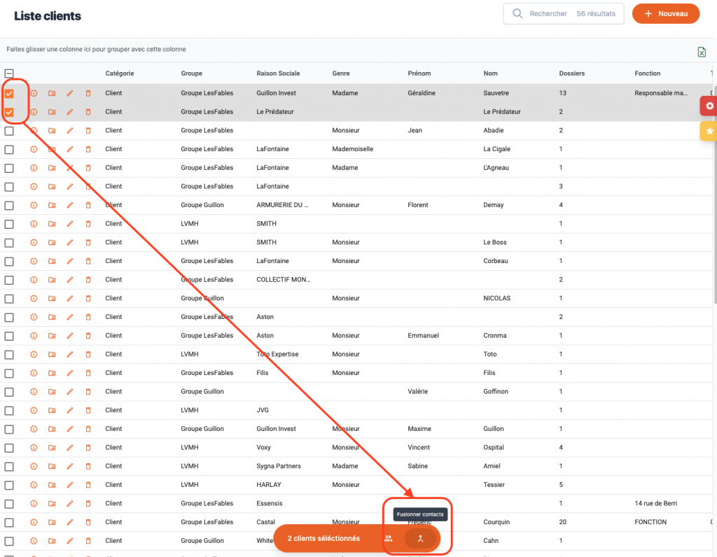 Si des doublons existent dans la liste de clients, il est possible de fusionner deux contacts en les sélectionnant à l’aide des cases à cocher.