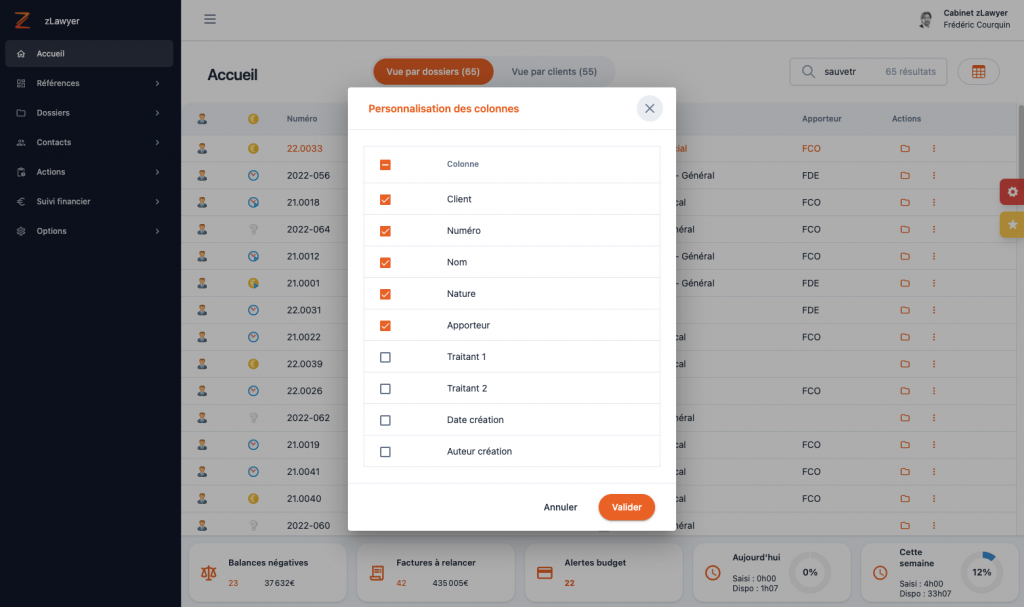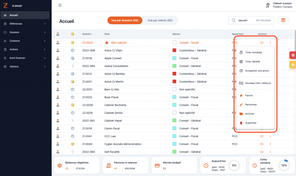 La page d’accueil peut-être personnalisée en affichant la liste des dossiers actifs.