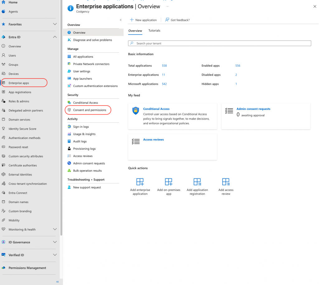 2. Sélectionnez l’onglet “Entreprise apps” puis le sous onglet “Consent and permissions”