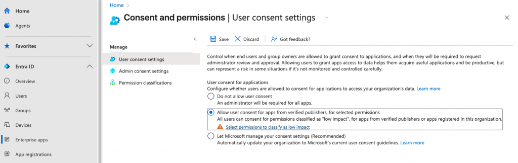 All users can consent for permissions classified as “low impact”, for apps from verified publishers or apps registered in this organization. »