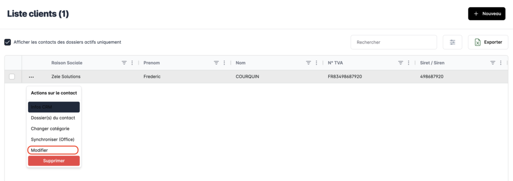 Une fois le contact sélectionné, vous pourrez mettre à jour ses informations à l’aide du Module de recherche SIREN / N° de TVA clients, en cliquant ici.