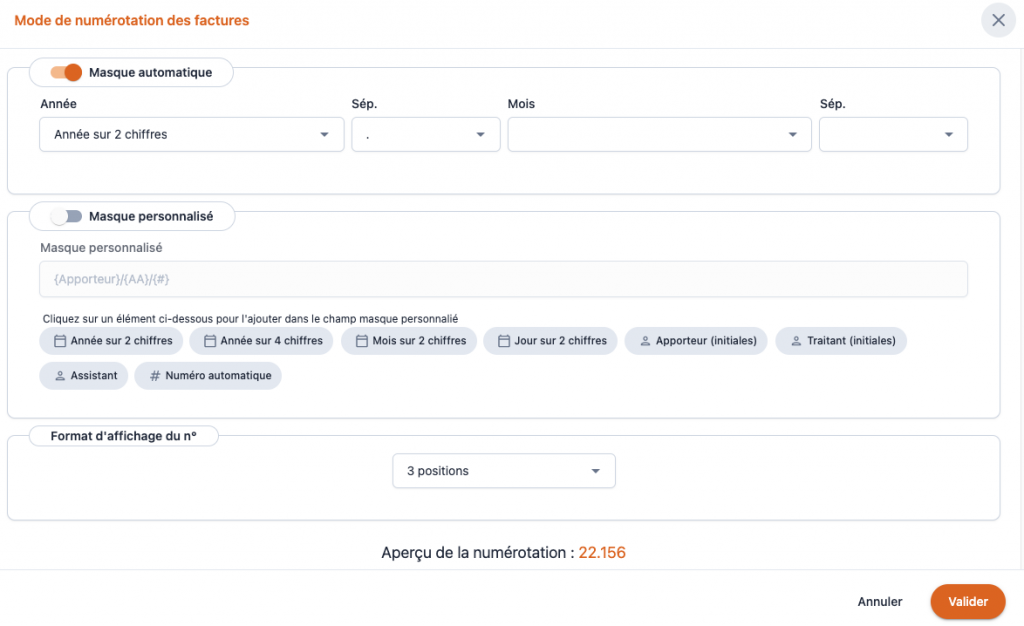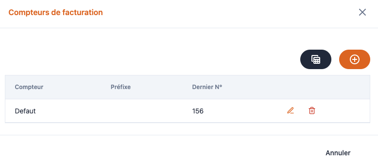Ce paramètre vous permet de régler votre ou vos compteurs de facturation. Cette fonctionnalité est disponible depuis le menu Options, puis Numérotation des factures.