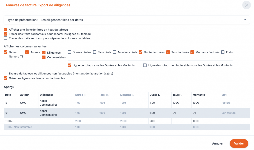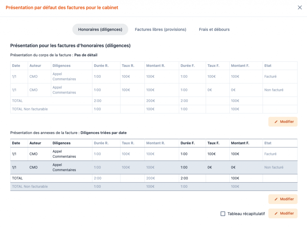 - Ce paramétrage de présentation pourra être appliqué pour la présentation des diligences dans le corps de la facture mais également pour les frais et débours.
